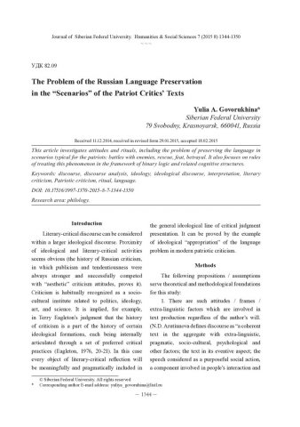 Библиографическое описание:Govorukhina, Yulia. The Problem of the Russian Language Preservation in the "Scenarios" of the Patriot Critics` Texts = Проблема сохранения русского языка в "сценариях" критиков-патриотов / Yu. А. Govorukhina. - Текст : непосредственный // Журнал Сибирского федерального университета. Гуманитарные науки. - 2015. - Т. 8, № 7. - С. 1344-1350. - Библиогр.: с. 1348-1350 (34 назв.). - ISSN 1997-1370.