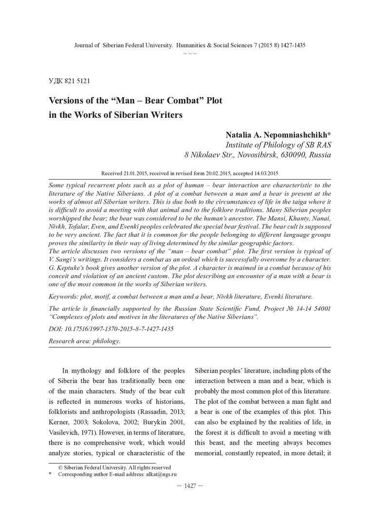 Библиографическое описание: Nepomniashchikh, Natalia. Versions of the "Man – Bear Combat" Plot in the Works of Siberian Writers = Варианты сюжета "поединок человека с медведем" в творчестве сибирских писателей / N. A. Nepomniashchikh. - Текст : непосредственный // Журнал Сибирского федерального университета. Гуманитарные науки. - 2015. - Т. 8, № 7. - С. 1427-1435. - Библиогр.: с. 1433-1435 (13 назв.). - ISSN 1997-1370.