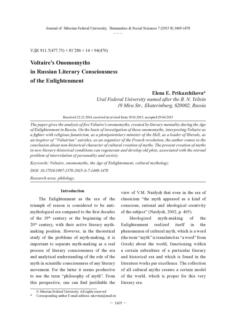 Библиографическое описание:Prikazchikova, Elena. Voltaire`s Onomomyths in Russian Literary Consciousness of the Enlightenment = Ономомифы Вольтера в русском литературном сознании эпохи просвещения / E. E. Prikazchikova. - Текст : непосредственный // Журнал Сибирского федерального университета. Гуманитарные науки. - 2015. - Т. 8, № 7. - С. 1469-1478. - Библиогр.: с. 1475-1478 (35 назв.). - ISSN 1997-1370.