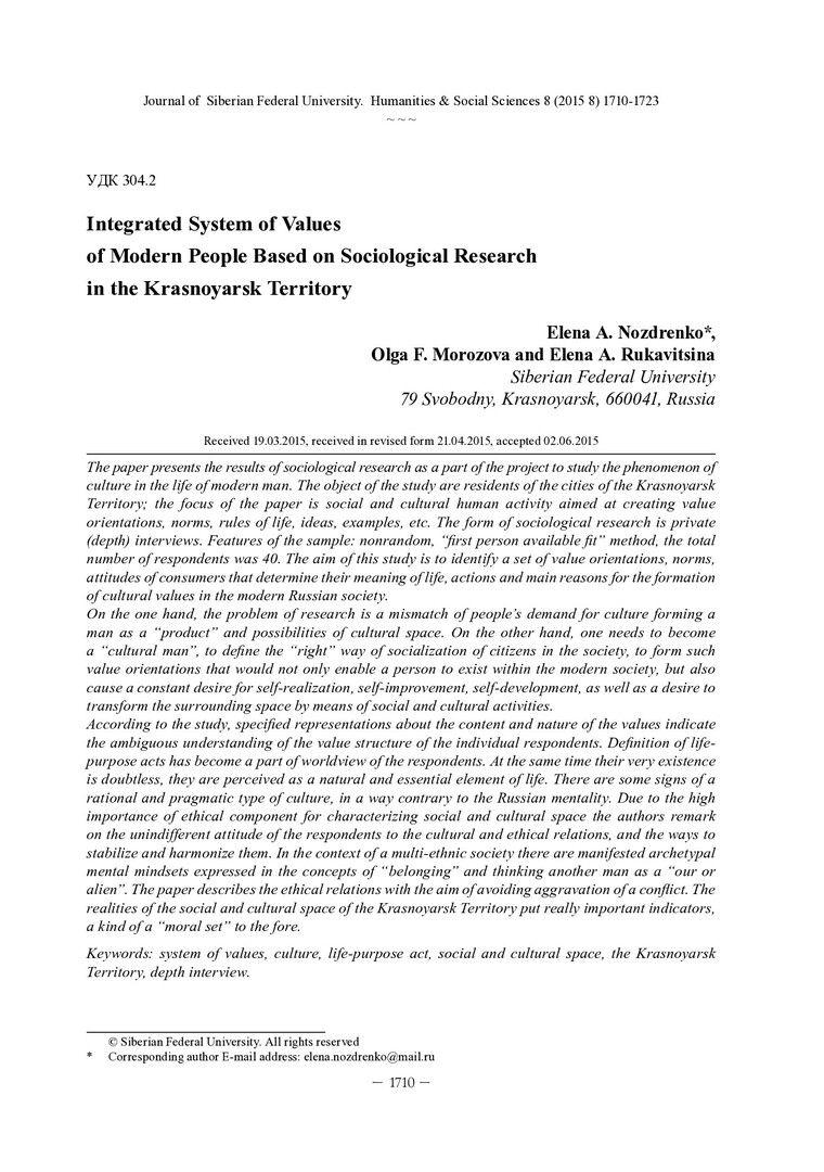 Библиографическое описание: Nozdrenko, Elena. Integrated System of Values of Modern People Based on Sociological Research in the Krasnoyarsk Territory = Комплексная система ценностей современного человека: по материалам социологического исследования в Красноярском крае / E. A. Nozdrenko, O. F. Morozova, E. A. Rukavitsina. - Текст : непосредственный // Журнал Сибирского федерального университета. Гуманитарные науки. - 2015. - Т. 8, № 8. - С. 1710-1723. - Библиогр.: с. 1722-1723 (3 назв.). - ISSN 1997-1370.