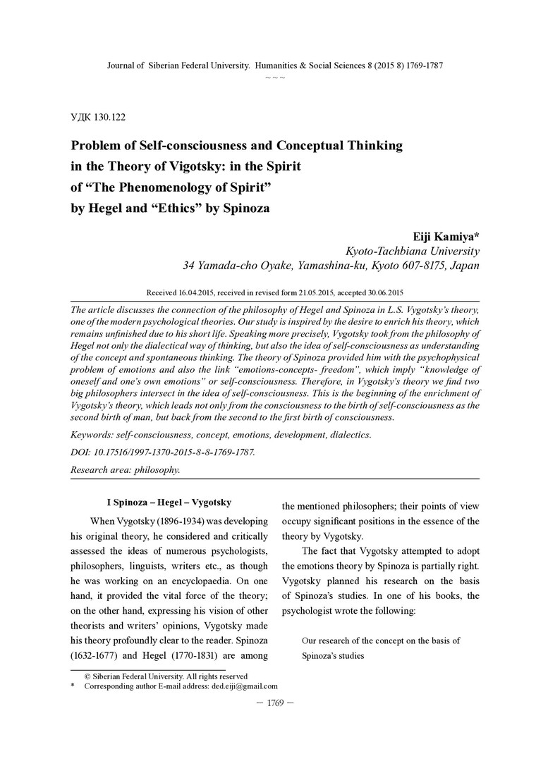 Библиографическое описание:Kamiya, Eiji. Problem of Self-consciousness and Conceptual Thinking in the Theory of Vigotsky: in the Spirit of "The Phenomenology of Spirit" by Hegel and "Ethics" by Spinoza = Проблема самосознания и понятийного мышления в теории Выготского: в духе "Феноменологии духа" Гегеля и "Этики" Спинозы / E. Kamiya. - Текст : непосредственный // Журнал Сибирского федерального университета. Гуманитарные науки. - 2015. - Т. 8, № 8. - С. 1769-1787. - Библиогр.: с. 1786-1787 (11 назв.). - ISSN 1997-1370.