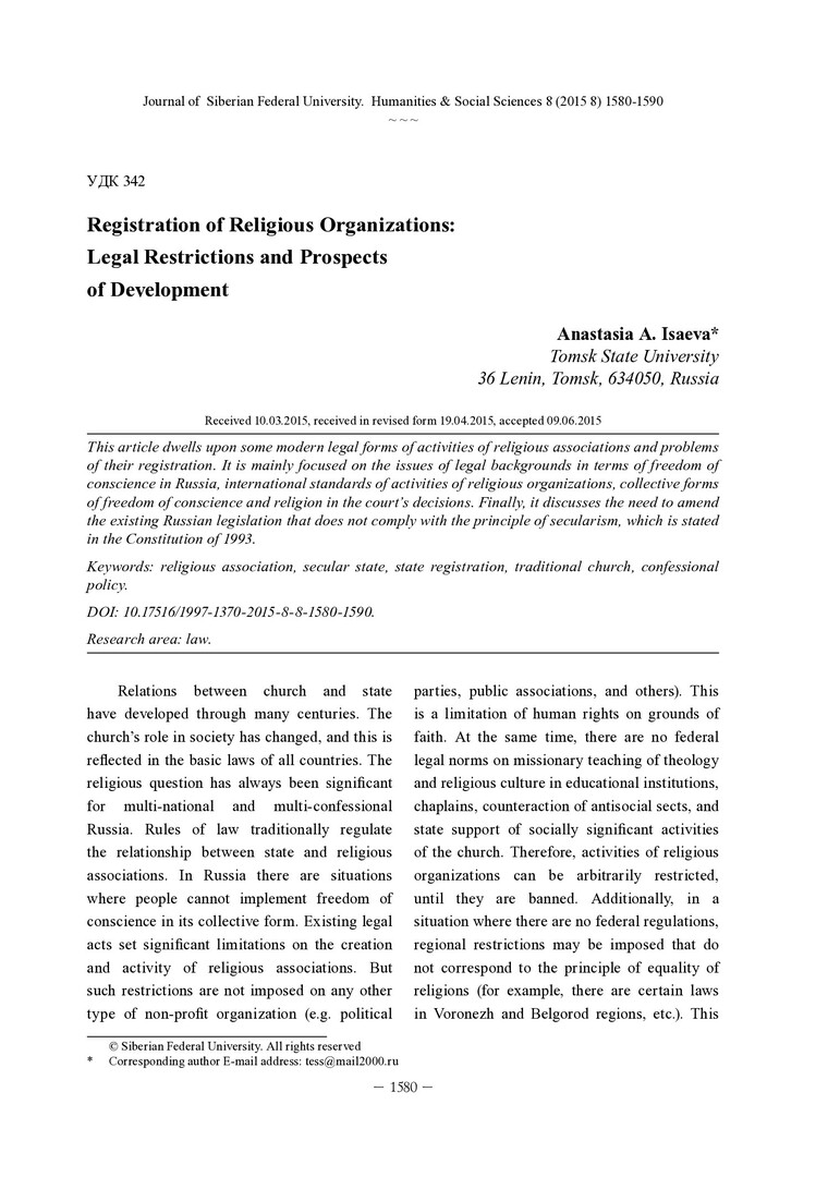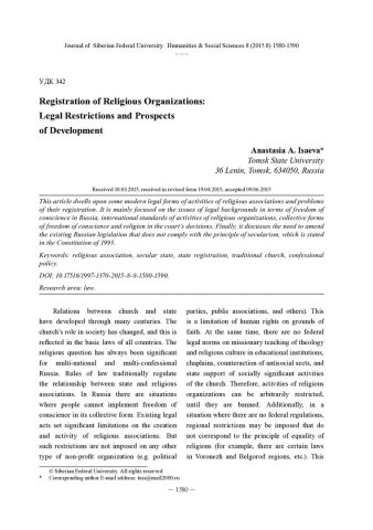 Библиографическое описание: Isaeva, Anastasia. Registration of Religious Organizations: Legal Restrictions and Prospects of Development = Регистрация религиозных организаций: правовые ограничения и перспективы развития / A. A. Isaeva. - Текст : непосредственный // Журнал Сибирского федерального университета. Гуманитарные науки. - 2015. - Т. 8, № 8. - С. 1580-1590. - Библиогр.: с. 1588-1590 (20 назв.). - ISSN 1997-1370.