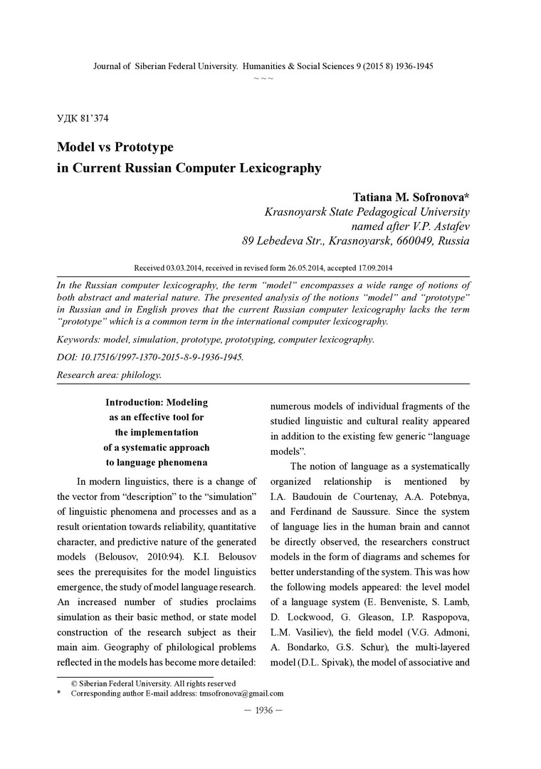 Библиографическое описание: Sofronova, Tatiana. Model vs Prototype in Current Russian Computer Lexicography = Модель vs-прототип в современной российской компьютерной лексикографии / T. M. Sofronova. - Текст : непосредственный // Журнал Сибирского федерального университета. Гуманитарные науки. - 2015. - Т. 8, № 9. - С. 1936-1945. - Библиогр.: с. 1942-1945 (34 назв.). - ISSN 1997-1370.