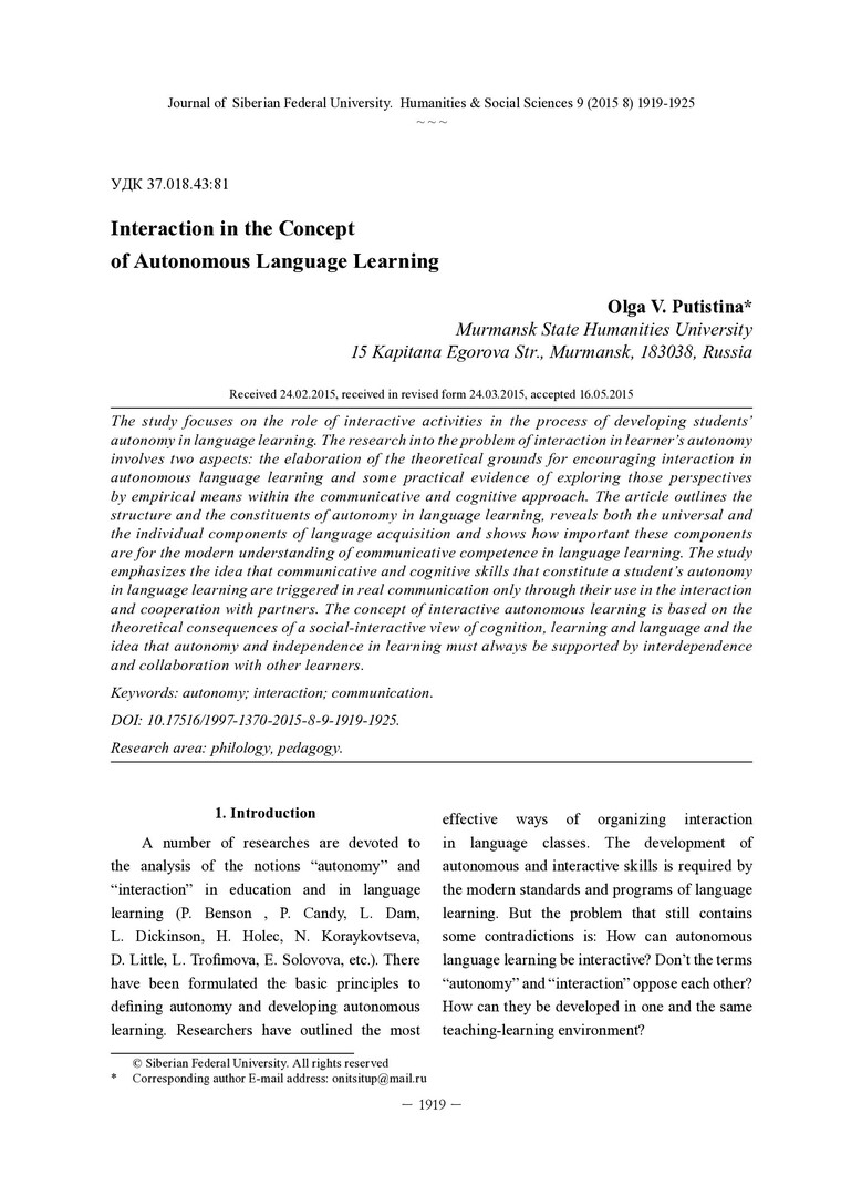 Библиографическое описание: Putistina, Olga. Interaction in the Concept of Autonomous Language Learning = Интерактивность в концепции развития автономии учащихся в процессе обучения иностранному языку / O. V. Putistina. - Текст : непосредственный // Журнал Сибирского федерального университета. Гуманитарные науки. - 2015. - Т. 8, № 9. - С. 1919-1925. - Библиогр.: с. 1923-1925 (20 назв.). - ISSN 1997-1370.