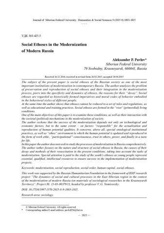 Библиографическое описание: Pavlov, Aleksander. Social Ethoses in the Modernization of Modern Russia = Социальные этосы в условиях модернизации современной России / A. P. Pavlov. - Текст : непосредственный // Журнал Сибирского федерального университета. Гуманитарные науки. - 2015. - Т. 8, № 9. - С. 1803-1815. - Библиогр.: с. 1813-1815 (17 назв.). - ISSN 1997-1370.