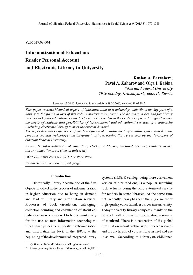 Библиографическое описание:Baryshev, Ruslan. Informatization of Education: Reader Personal Account and Electronic Library in University = Информатизация образования: личный кабинет читателя и место электронной библиотеки в вузе / R. A. Baryshev, P. A. Zaharov, O. I. Babina. - Текст : непосредственный // Журнал Сибирского федерального университета. Гуманитарные науки. - 2015. - Т. 8, № 9. - С. 1979-1989. - Библиогр.: с. 1985-1989 (38 назв.). - ISSN 1997-1370.