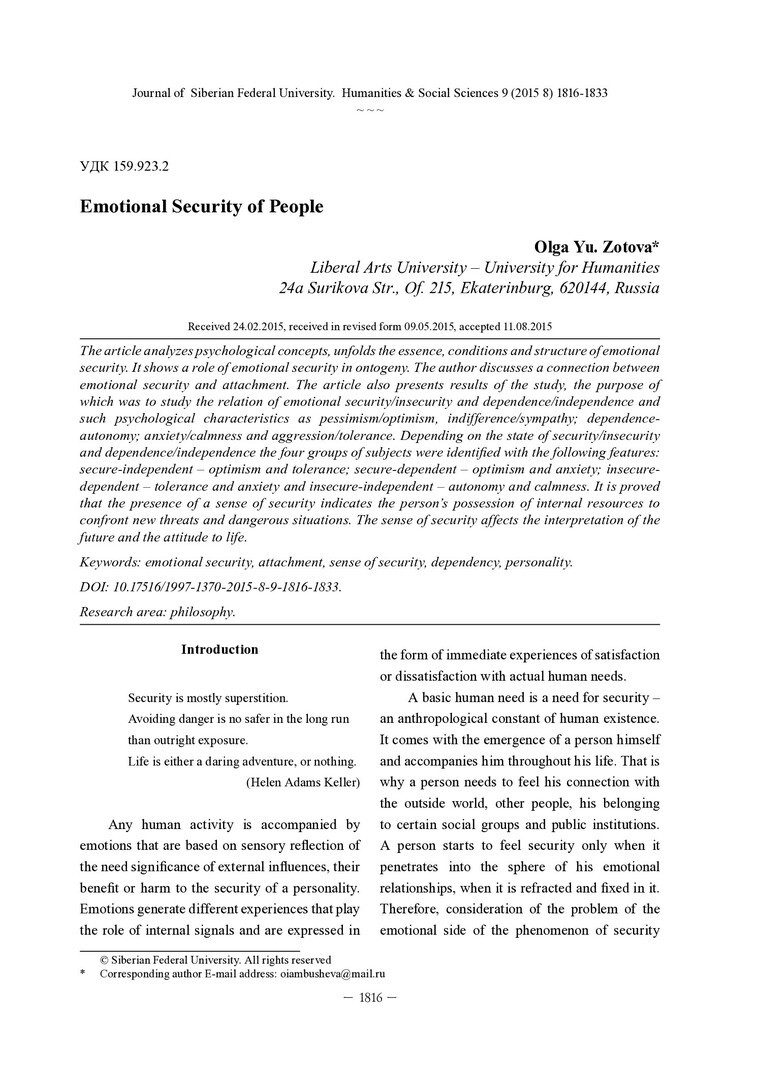 Библиографическое описание:Zotova, Olga. Emotional Security of People = Эмоциональная безопасность личности / O. Yu. Zotova. - Текст : непосредственный // Журнал Сибирского федерального университета. Гуманитарные науки. - 2015. - Т. 8, № 9. - С. 1816-1833. - Библиогр.: с. 1830-1833 (56 назв.). - ISSN 1997-1370.