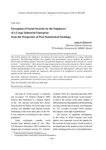 Библиографическое описание:Kareeva, Аnna. Perception of Social Security by the Employees of a Large Industrial Enterprise from the Perspective of Post-Nonclassical Sociology = Восприятие социальной безопасности сотрудниками крупного промышленного предприятия с позиции постнеклассической социологии / А. P. Kareeva. - Текст : непосредственный // Журнал Сибирского федерального университета. Гуманитарные науки. - 2015. - Т. 8, № 9. - С. 1886-1892. - Библиогр.: с. 1891-1892(13 назв.). - ISSN 1997-1370.