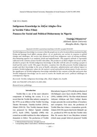 Библиографическое описание:Temitope Olumuyiwa. Indigenous Knowledge in AbEn i Alagbo-Oru (a Yoruba Video Film): Panacea for Social and Political Disharmony in Nigeria = Знания коренных народов в Абени Алагбо-Ору (Фильм Йоруба): панацея от социальной и политической нестабильности в Нигерии / Temitope Olumuyiwa. - Текст : непосредственный // Журнал Сибирского федерального университета. Гуманитарные науки. - 2015. - Т. 8, № 9. - С. 1893-1904. - Библиогр.: с. 1901-1904 (30 назв.). - ISSN 1997-1370.