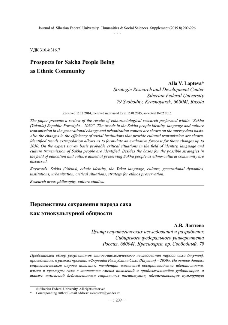Библиографическое описание: Лаптева, Алла. Перспективы сохранения народа Саха как этнокультурной общности = Prospects for Sakha People Being as Ethnic Community / А. В. Лаптева. - Текст : непосредственный // Журнал Сибирского федерального университета. Гуманитарные науки. - 2015. - Т. 8, Supplement. - С. 209-226. - Библиогр.: с. 225-226 (23 назв.). - ISSN 1997-1370.