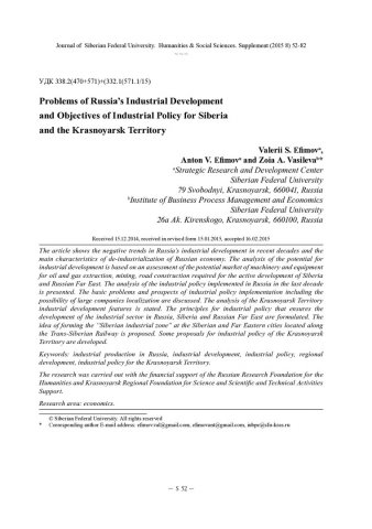 Библиографическое описание: Ефимов, Валерий. Проблемы промышленного развития России и задачи промышленной политики для Сибири и Красноярского края = Problems of Russia`s Industrial Development and Objectives of Industrial Policy for Siberia and the Krasnoyarsk Territory / В. С. Ефимов, А. В. Ефимов, З. А. Васильева. - Текст : непосредственный // Журнал Сибирского федерального университета. Гуманитарные науки. - 2015. - Т. 8, Supplement. - С. 52-82. - Библиогр.: с. 80-82 (33 назв.). - ISSN 1997-1370.