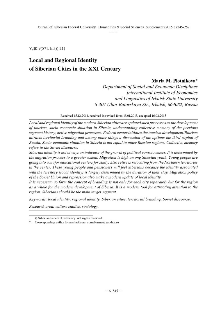 Библиографическое описание: Плотникова, Мария. Локальная и региональная идентичность сибирских городов в XXI в. = Local and Regional Identity of Siberian Cities in the XXI Century / М. М. Плотникова. - Текст : непосредственный // Журнал Сибирского федерального университета. Гуманитарные науки. - 2015. - Т. 8, Supplement. - С. 245-252. - Библиогр.: с. 251-252 (9назв.). - ISSN 1997-1370.