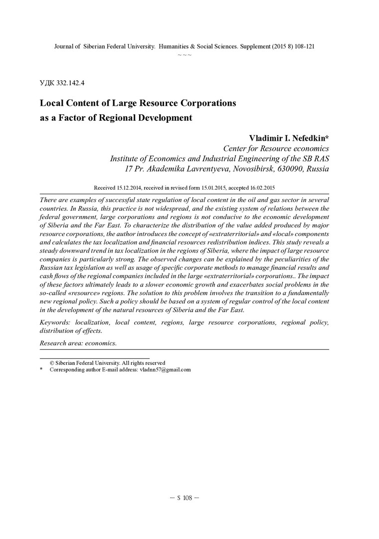 Библиографическое описание: Нефедкин, Владимир. Локальный контент крупных ресурсных корпораций как фактор регионального развития / В. И. Нефедкин. - Текст : непосредственный // Журнал Сибирского федерального университета. Гуманитарные науки. - 2015. - Т. 8, Supplement. - С. 108-121. - Библиогр.: с. 121 (10 назв.). - ISSN 1997-1370.