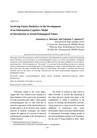 Библиографическое описание:Smirnaia, Anastasiya. Involving Future Bachelors in the Development of an Information-Cognitive Model of Introduction to Social-Pedagogical Values = Включение будущих бакалавров в разработку информационно-познавательной модели приобщения к социально-педагогическим ценностям / A. A. Smirnaia, V. V. Ignatova. - Текст : непосредственный // Журнал Сибирского федерального университета. Гуманитарные науки. - 2016. - Т. 9, № 1. - С. 126-132. - Библиогр.: с. 131-132. - ISSN 1997-1370.