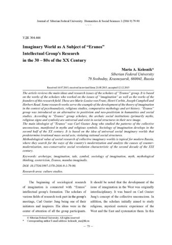 Библиографическое описание:Kolesnik, Maria. Imaginary World as A Subject of "Eranos" Intellectual Group`s Research in the 30 – 80s of the XX Century = Воображаемый мир как предмет исследования интеллектуальной группы "Эранос" в 30 – 80-е гг. ХХ века / M. A. Kolesnik. - Текст : непосредственный // Журнал Сибирского федерального университета. Гуманитарные науки. - 2016. - Т. 9, № 1. - С. 79-90. - Библиогр.: с. 85-90. - ISSN 1997-1370.