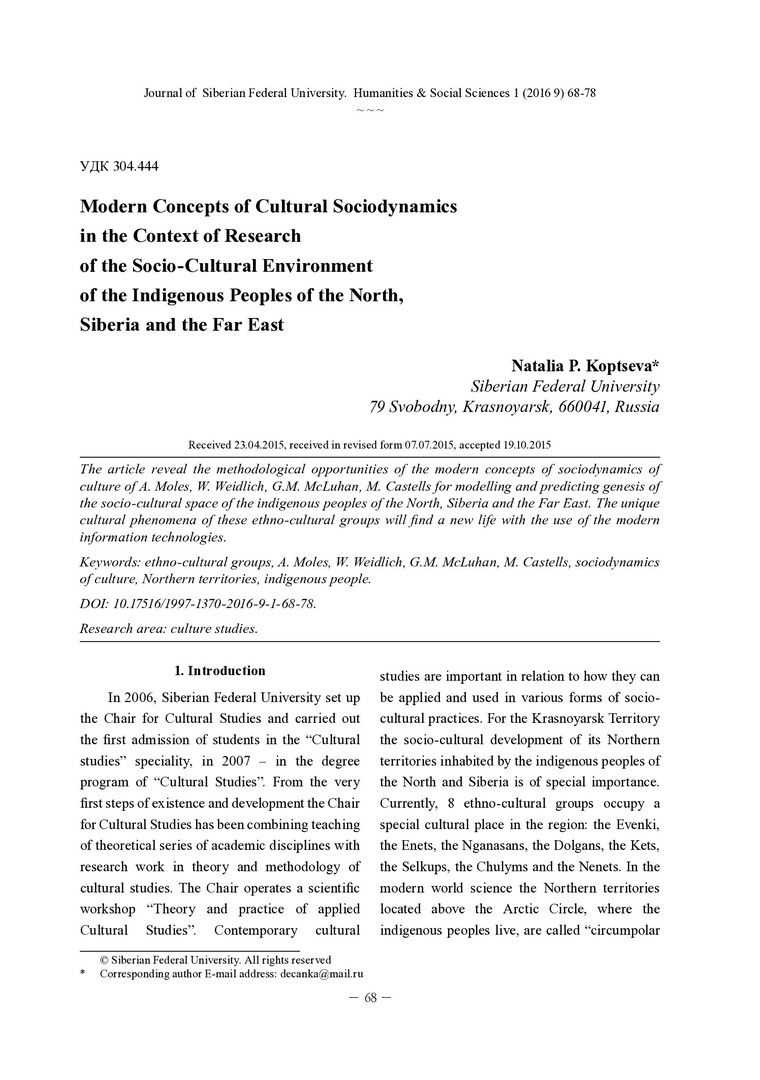 Библиографическое описание:Koptseva, Natalia. Modern Concepts of Cultural Sociodynamics in the Context of Research of the Socio-Cultural Environment of the Indigenous Peoples of the North, Siberia and the Far East = Современные концепции социодинамики культуры в контексте исследования социально-культурного пространства коренных малочисленных народов Севера, Сибири и Дальнего Востока / N. P. Koptseva. - Текст : непосредственный // Журнал Сибирского федерального университета. Гуманитарные науки. - 2016. - Т. 9, № 1. - С. 68-78. - Библиогр.: с. 78. - ISSN 1997-1370.