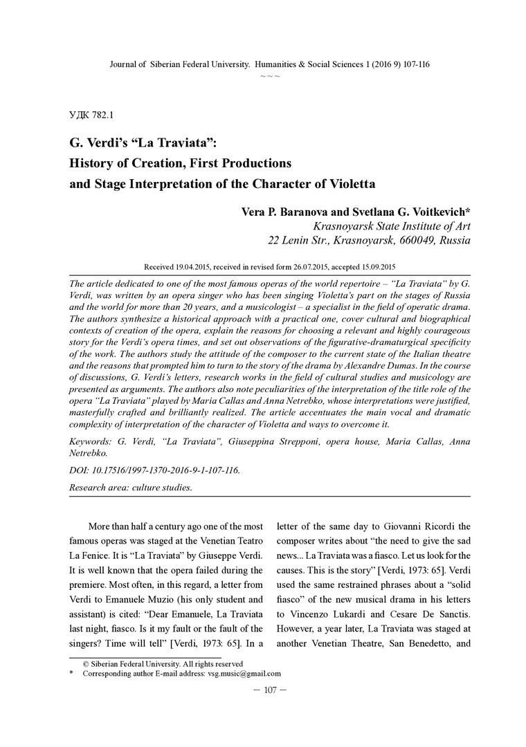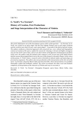 Библиографическое описание:Baranova, Vera. G. Verdi`s "La Traviata": History of Creation, First Productions and Stage Interpretation of the Character of Violetta = Опера Дж. Верди "Травиата": к вопросу об истории создания, первых постановок и сценической трактовке образа Виолетты / V. P. Baranova, S. G. Voitkevich. - Текст : непосредственный // Журнал Сибирского федерального университета. Гуманитарные науки. - 2016. - Т. 9, № 1. - С. 107-116. - Библиогр.: с. 115-116. - ISSN 1997-1370.