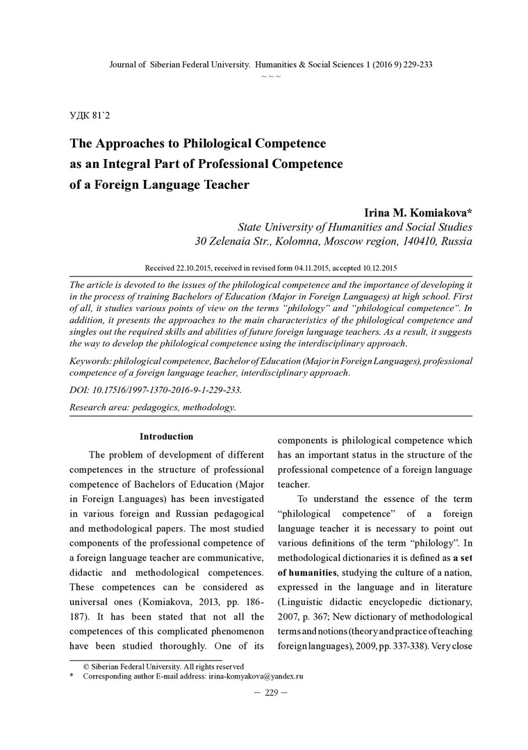 Библиографическое описание:Komiakova, Irina. The Approaches to Philological Competence as an Integral Part of Professional Competence of a Foreign Language Teacher = Подходы к определению филологической компетенции как неотъемлемой части профессиональной компетентности учителя иностранного языка / I. M. Komiakova. - Текст : непосредственный // Журнал Сибирского федерального университета. Гуманитарные науки. - 2016. - Т. 9, № 1. - С. 229-233. - Библиогр.: с. 232-233. - ISSN 1997-1370.
