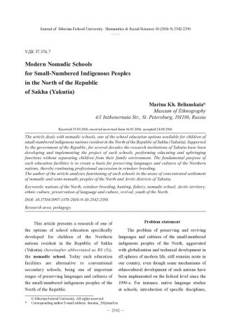 Modern Nomadic Schools for Small-Numbered Indigenous Peoples in the North of the Republic of Sakha (Yakutia)статья из журнала