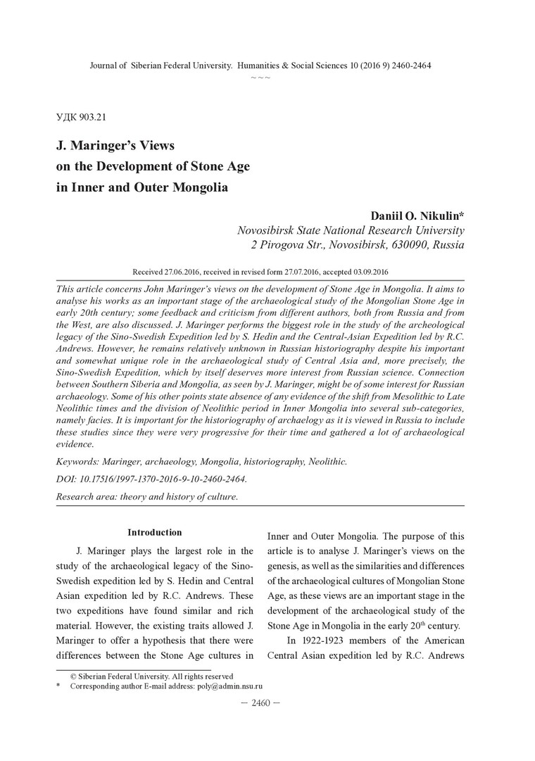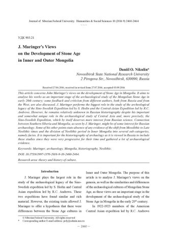 Аннотация:Затрагиваются взгляды Дж. Марингера на развитие каменного века в Монголии. Необходимо рассматривать его работы как важную стадию истории археологического изучения каменного века Монголии в первой трети XX в.; также затронуты критика и мнение о Дж. Марингере различных авторов, как российских, так и зарубежных.