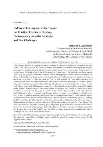Библиографическое описание:Alekseeva, Sardaana. Culture of Life-support of the Tungus: the Practice of Reindeer Herding, Contemporary Adaptive Strategies and New Challenges = Культура жизнеобеспечения тунгусов: практики ведения оленеводства, современные адаптивные стратегии и новые вызовы / S. A. Alekseeva. - Текст : непосредственный // Журнал Сибирского федерального университета. Гуманитарные науки. - 2016. - Т. 9, № 10. - С. 2305-2314. - Библиогр.: с. 2313-2314. - ISSN 1997-1370.