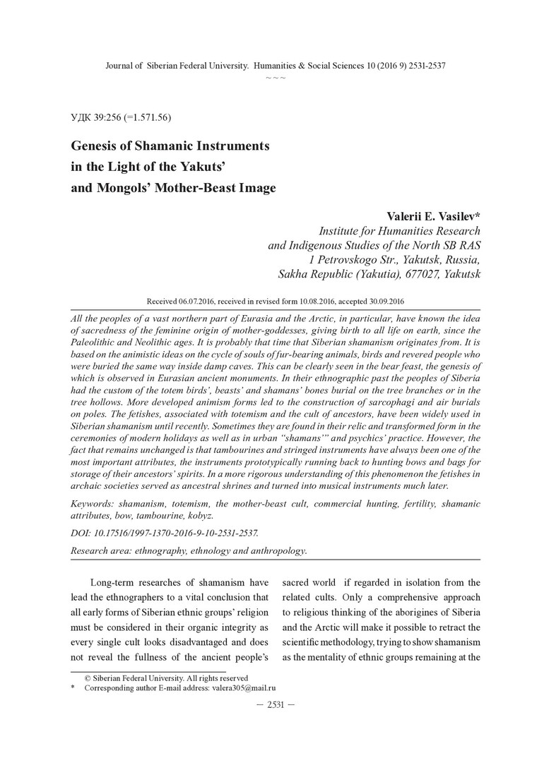 Genesis of Shamanic Instruments in the Light of the Yakuts` and Mongols` Mother-Beast Imageстатья из журнала