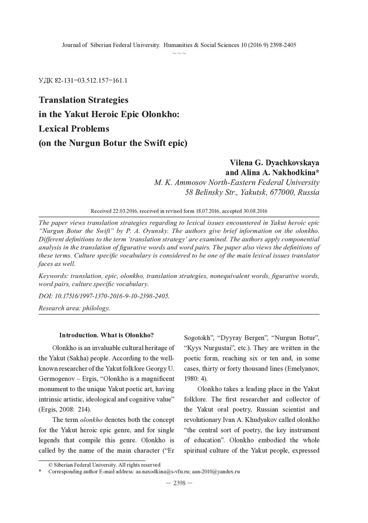 Библиографическое описание:Dyachkovskaya, Vilena. Translation Strategies in the Yakut Heroic Epic Olonkho: Lexical Problems (on the Nurgun Botur the Swift epic) = Переводческие стратегии в якутском героическом эпосе Олонхо: лексические проблемы (на материале эпоса "Нюргун Боотур Стремительный") / V. G. Dyachkovskaya, A. A. Nakhodkina. - Текст : непосредственный // Журнал Сибирского федерального университета. Гуманитарные науки. - 2016. - Т. 9, № 10. - С. 2398-2405. - Библиогр.: с. 2404-2405. - ISSN 1997-1370.