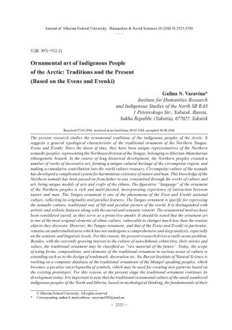 Библиографическое описание:Varavina, Galina. Ornamental art of Indigenous People of the Arctic: Traditions and the Present (Based on the Evens and Evenki) = Орнаментальное искусство коренных народов Арктики: традиции и современность (на примере эвенов и эвенков) / G. N. Varavina. - Текст : непосредственный // Журнал Сибирского федерального университета. Гуманитарные науки. - 2016. - Т. 9, № 10. - С. 2525-2530. - Библиогр.: с. 2528-2530. - ISSN 1997-1370.