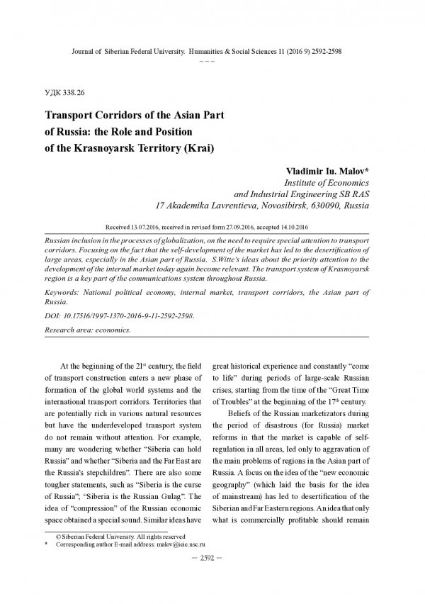 Библиографическое описание:Malov, Vladimir. Transport Corridors of the Asian Part of Russia: the Role and Position of the Krasnoyarsk Territory (Krai) = Транспортные коридоры азиатской части России: место и роль Красноярского края / V. Iu. Malov. - Текст : непосредственный // Журнал Сибирского федерального университета. Гуманитарные науки. - 2016. - Т. 9, № 11. - С. 2592-2598. - Библиогр.: с. 2597-2598. - ISSN 1997-1370.
