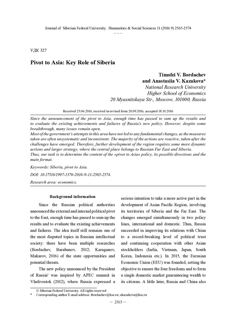 Библиографическое описание:Bordachev, Timofei. Pivot to Asia: Key Role of Siberia = Поворот на Восток: ключевая роль Cибири / T. V. Bordachev, A. V. Kazakova. - Текст : непосредственный // Журнал Сибирского федерального университета. Гуманитарные науки. - 2016. - Т. 9, № 11. - С. 2565-2574. - Библиогр.: с. 2573-2574. - ISSN 1997-1370.