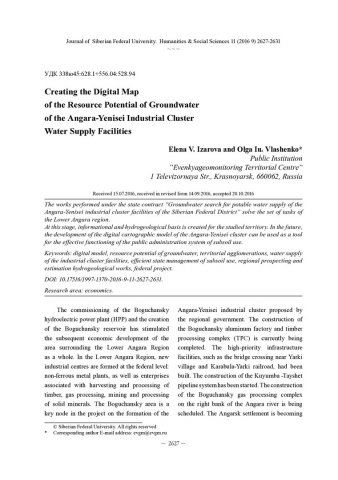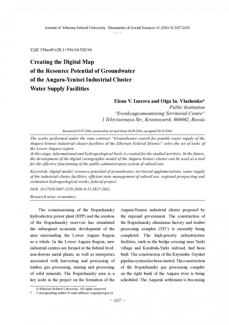 Библиографическое описание:Izarova, Elena. Creating the Digital Map of the Resource Potential of Groundwater of the Angara-Yenisei Industrial Cluster Water Supply Facilities = Создание цифровой модели карты ресурсного потенциала подземных вод для водоснабжения объектов Ангаро-Енисейского промышленного кластера / E. V. Izarova. - Текст : непосредственный // Журнал Сибирского федерального университета. Гуманитарные науки. - 2016. - Т. 9, № 11. - С. 2627-2631. - Библиогр.: с. 2631. - ISSN 1997-1370.