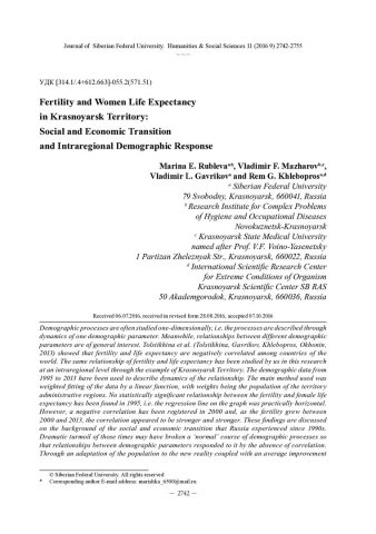 Библиографическое описание:Fertility and Women Life Expectancy in Krasnoyarsk Territory: Social and Economic Transition and Intraregional Demographic Response = Фертильность и ожидаемая продолжительность жизни женщин в Красноярском крае: внутрирегиональный демографический отклик на фоне социально-экономических трансформаций / M. E. Rubleva [и др.]. - Текст : непосредственный // Журнал Сибирского федерального университета. Гуманитарные науки. - 2016. - Т. 9, № 11. - С. 2742-2755. - Библиогр.: с. 2752-2755. - ISSN 1997-1370.