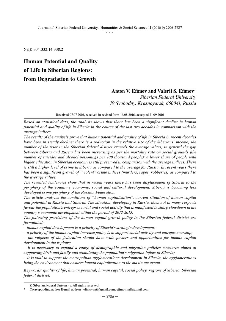 Библиографическое описание:Efimov, Anton. Human Potential and Quality of Life in Siberian Regions: from Degradation to Growth = Человеческий потенциал и качество жизни в сибирских регионах: от деградации к росту / A. V. Efimov, V. S. Efimov. - Текст : непосредственный // Журнал Сибирского федерального университета. Гуманитарные науки. - 2016. - Т. 9, № 11. - С. 2706-2727. - Библиогр.: с. 2724-2727. - ISSN 1997-1370.