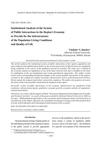 Ключевые слова:институциональный анализ, инфраструктура жизнедеятельности, инфраструктурные блага, качество жизни, экономический анализ, экономический рост