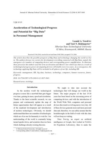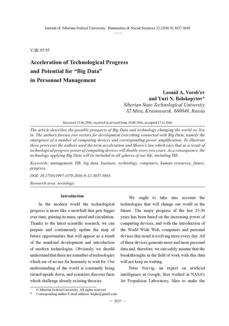 Библиографическое описание:Vorob`ev, Leonid. Acceleration of Technological Progress and Potential for "Big Data" in Personnel Management / L. A. Vorob`ev, = Ускорение технологического прогресса и возможности применения "Больших данных" в управлении персоналом. - Текст : непосредственный // Журнал Сибирского федерального университета. Гуманитарные науки. - 2016. - Т. 9, № 12. -С. 3037-3043. - Библиогр.: с. 3043. - ISSN 1997-1370.