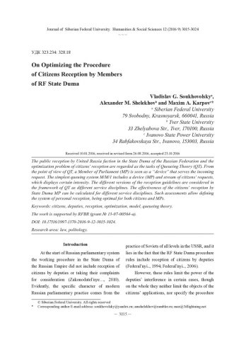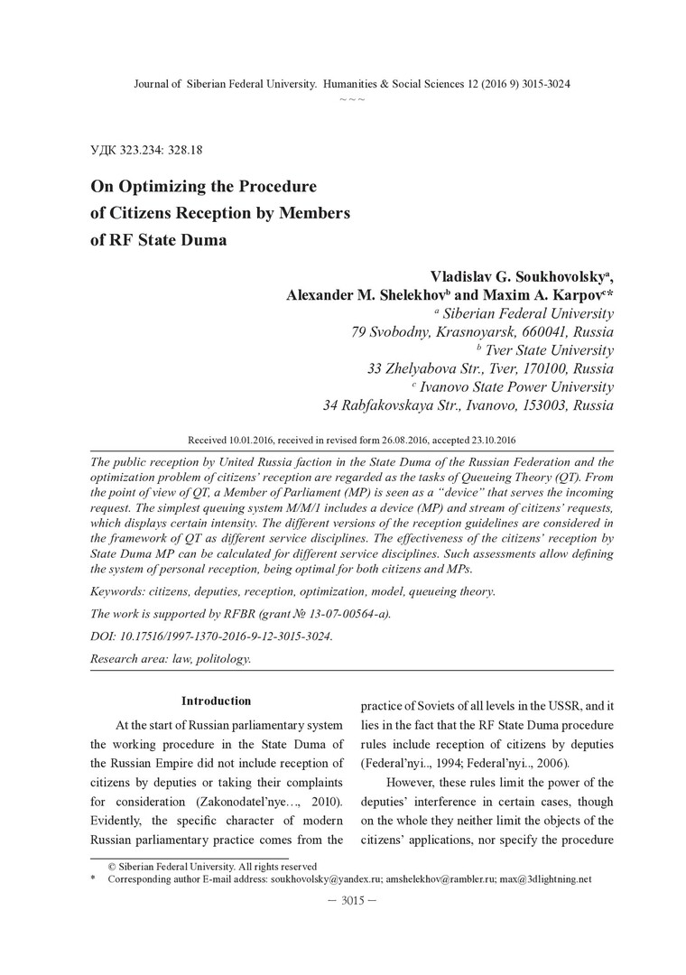Библиографическое описание: Soukhovolsky, Vladislav G... On Optimizing the Procedure of Citizens Reception by Members of RF State Duma / Vladislav G. Soukhovolsky, A. M. Shelekhov, M. A. Karpov = Оптимизация процедуры приема граждан депутатами Государственной думы РФ. - Текст : непосредственный // Журнал Сибирского федерального университета. Гуманитарные науки. - 2016. - Т. 9, № 12. -С. 3015-3024. - Библиогр.: с. 3023-3024. - ISSN 1997-1370.