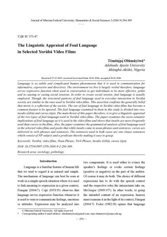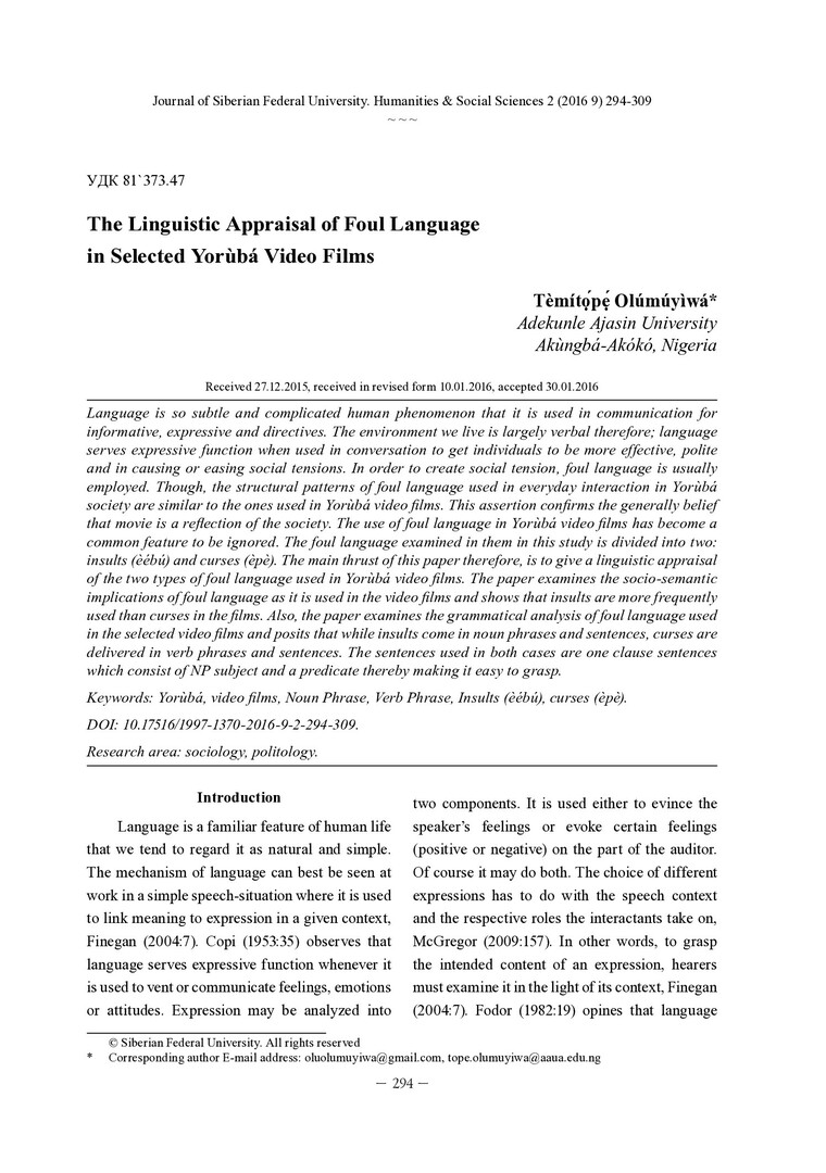 Библиографическое описание: Temitope Olumuyiwa. The Linguistic Appraisal of Foul Language = Лингвистическая оценка ненормативной лексики в избранных телевизионных фильмах Йорубы / Temitope Olumuyiwa. - Текст : непосредственный // Журнал Сибирского федерального университета. Гуманитарные науки. - 2016. - Т. 9, № 2. - С. 294-309. - Библиогр.: с. 307-309. - ISSN 1997-1370.