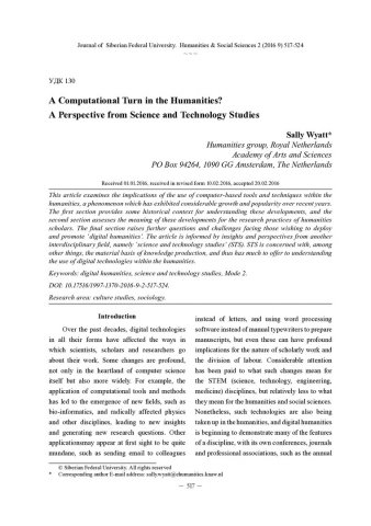 Библиографическое описание: Wyatt, Sally. A Computational Turn in the Humanities? A Perspective from Science and Technology Studies = Вычислительный подход в гуманитарных науках с точки зрения научно-технических исследований / S. Wyatt. - Текст : непосредственный // Журнал Сибирского федерального университета. Гуманитарные науки. - 2016. - Т. 9, № 2. - С. 517-524. - Библиогр.: с. 522-524. - ISSN 1997-1370.