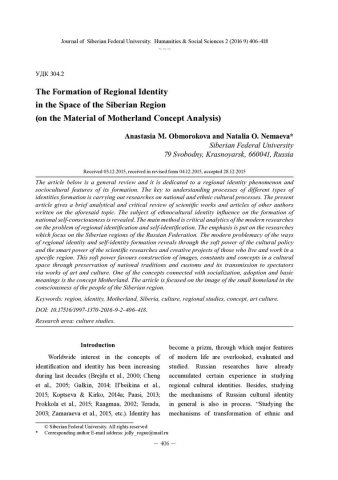 Библиографическое описание:Obmorokova, Anastasia. The Formation of Regional Identity in the Space of the Siberian Region (on the Material of Motherland Concept Analysis) = Становление региональной идентичности в пространстве сибирского региона (на материале анализа концепта "Родина") / A. M. Obmorokova, N. O. Nemaeva. - Текст : непосредственный // Журнал Сибирского федерального университета. Гуманитарные науки. - 2016. - Т. 9, № 2. - С. 406-418. - Библиогр.: с. 414-418. - ISSN 1997-1370.