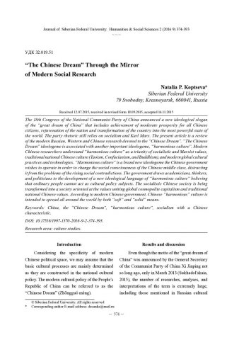 Библиографическое описание: Koptseva, Natalia. "The Chinese Dream" Through the Mirror of Modern Social Research = "Китайская мечта" в зеркале современных социальных исследований / N. P. Koptseva. - Текст : непосредственный // Журнал Сибирского федерального университета. Гуманитарные науки. - 2016. - Т. 9, № 2. - С. 374-393. - Библиогр.: с. 388-393. - ISSN 1997-1370.