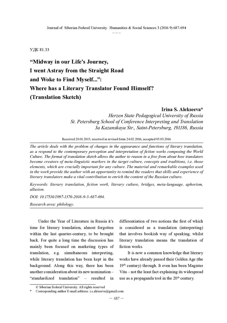 Библиографическое описание:Alekseeva, Irina. "Midway in our Life`s Journey, I went Astray from the Straight Road and Woke to Find Myself...": Where has a Literary Translator Found Himself? (Translation Sketch) = "Земную жизнь пройдя до половины, я очутился…": Где же очутился художественный переводчик? (переводческий скетч) / I. S. Alekseeva. - Текст : непосредственный // Журнал Сибирского федерального университета. Гуманитарные науки. - 2016. - Т. 9, № 3. - С. 687-694. - ISSN 1997-1370.