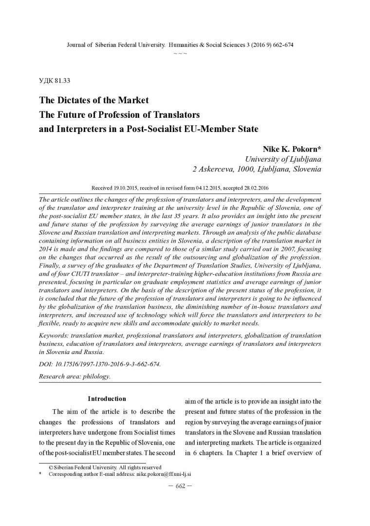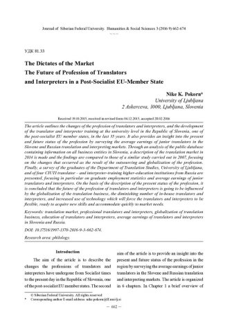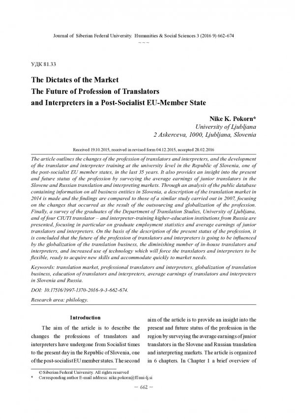 Библиографическое описание:Pokorn, Nike. The Dictates of the Market The Future of Profession of Translators and Interpreters in a Post-Socialist EU-Member State = Диктат рынка. Будущее профессии письменного и устного переводчика в постсоциалистическом государстве – члене ЕС / N. K. Pokorn. - Текст : непосредственный // Журнал Сибирского федерального университета. Гуманитарные науки. - 2016. - Т. 9, № 3. - С. 662-674. - Библиогр.: с. 673-674. - ISSN 1997-1370.