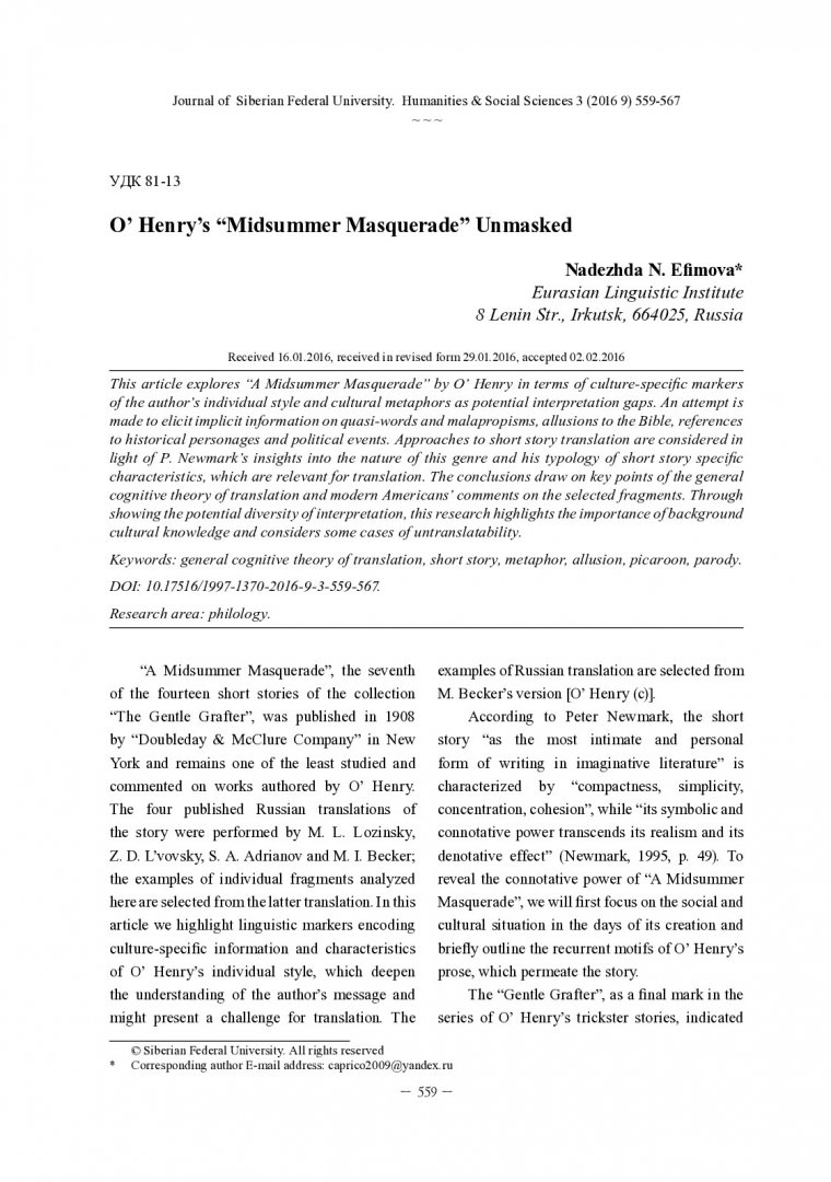 Библиографическое описание: Efimova, Nadezhda. O’ Henry’s "Midsummer Masquerade" Unmasked = О` Генри: маски "Летнего маскарада" / N. N. Efimova. - Текст : непосредственный // Журнал Сибирского федерального университета. Гуманитарные науки. - 2016. - Т. 9, № 3. - С. 559-567. - Библиогр.: с. 566-567. - ISSN 1997-1370.