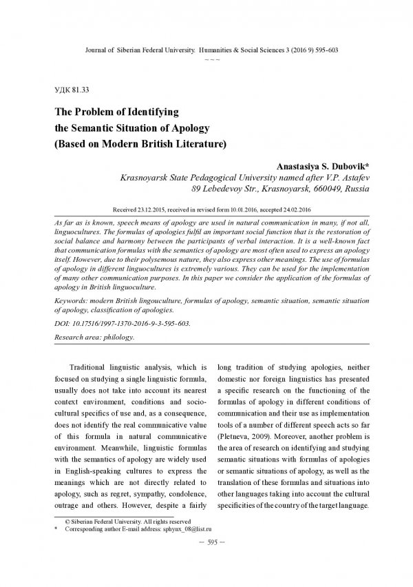 Библиографическое описание:Dubovik, Anastasiya. The Problem of Identifying the Semantic Situation of Apology (Based on Modern British Literature) = Проблема выделения семантической ситуации извинения (на материале современной британской литературы) / A. S. Dubovik. - Текст : непосредственный // Журнал Сибирского федерального университета. Гуманитарные науки. - 2016. - Т. 9, № 3. - С. 595-603. - Библиогр.: с. 602-603. - ISSN 1997-1370.