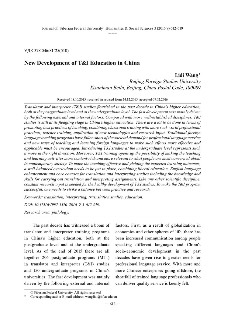 Библиографическое описание: Wang, Lidi. New Development of T and I Education in China = Новое развитие переводческого образования в Китае / L. Wang. - Текст : непосредственный // Журнал Сибирского федерального университета. Гуманитарные науки. - 2016. - Т. 9, № 3. - С. 612-619. - Библиогр.: с. 618-619. - ISSN 1997-1370.