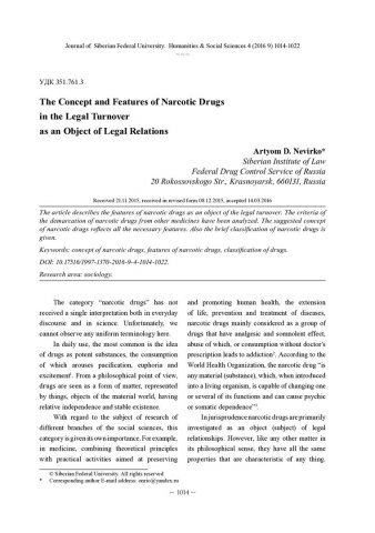 Библиографическое описание:Nevirko, Artyom. The Concept and Features of Narcotic Drugs in the Legal Turnover as an Object of Legal Relations = Понятие и признаки наркотических средств в легальном обороте как объекта правоотношений / A. D. Nevirko. - Текст : непосредственный // Журнал Сибирского федерального университета. Гуманитарные науки. - 2016. - Т. 9, № 4. - С. 1014-1022. - Библиогр.: с. 1021-1022. - ISSN 1997-1370.