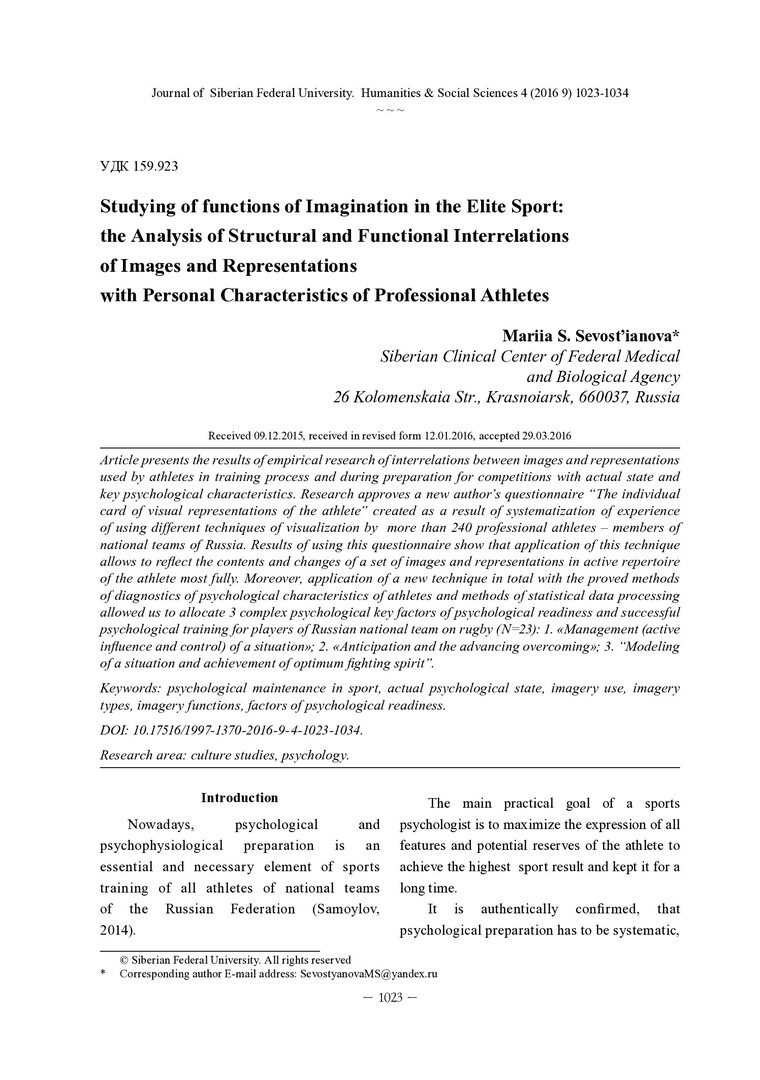 Библиографическое описание:Sevost`ianova, Mariia. Studying of functions of Imagination in the Elite Sport: the Analysis of Structural and Functional Interrelations of Images and Representations with Personal Characteristics of Professional Athletes = Изучение функций воображения в спорте высших достижений: анализ структурно-функциональных взаимосвязей образов и представлений с личностными характеристиками профессиональных спортсменов / M. S. Sevost`ianova. - Текст : непосредственный // Журнал Сибирского федерального университета. Гуманитарные науки. - 2016. - Т. 9, № 4. - С. 1023-1034. - Библиогр.: с. 1033-1034. - ISSN 1997-1370.