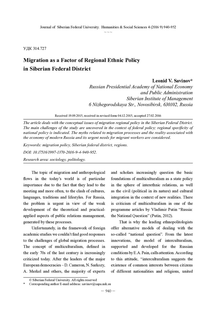 Библиографическое описание:Savinov, Leonid. Migration as a Factor of Regional Ethnic Policy in Siberian Federal District = Миграция как фактор региональной этнополитики в Сибирском федеральном округе / L. V. Savinov. - Текст : непосредственный // Журнал Сибирского федерального университета. Гуманитарные науки. - 2016. - Т. 9, № 4. - С. 940-952. - Библиогр.: с. 950-952. - ISSN 1997-1370.
