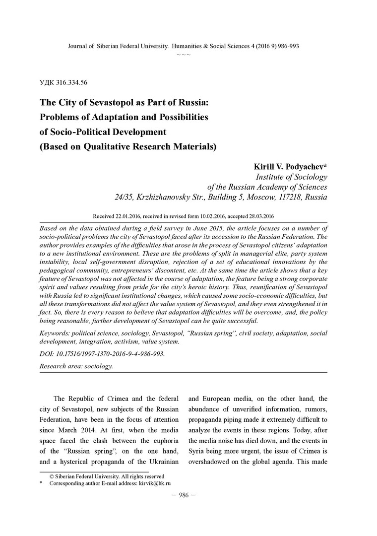 Библиографическое описание:Podyachev, Kirill. The City of Sevastopol as Part of Russia: Problems of Adaptation and Possibilities of Socio-Political Development (Based on Qualitative Research Materials) = Город Севастополь в составе России: проблемы адаптации и возможности социально-политического развития (по материалам качественного исследования) / K. V. Podyachev. - Текст : непосредственный // Журнал Сибирского федерального университета. Гуманитарные науки. - 2016. - Т. 9, № 4. - С. 986-993. - Библиогр.: с. 992-993. - ISSN 1997-1370.