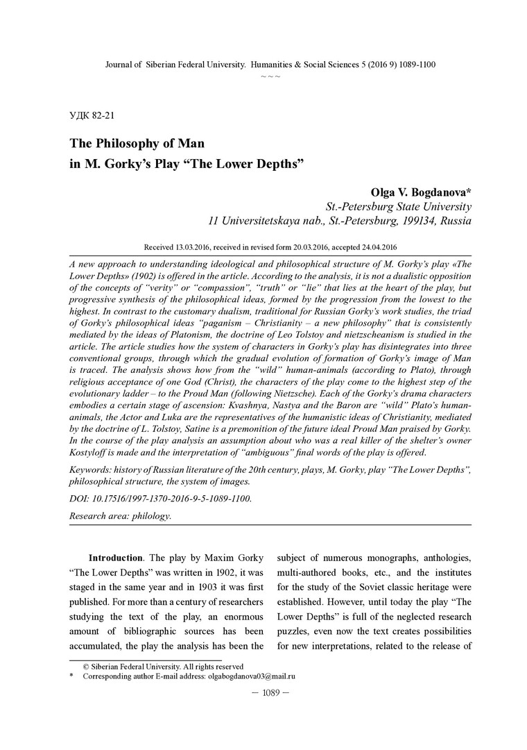 Библиографическое описание: Bogdanova, Olga. The Philosophy of Man in M. Gorky`s Play "The Lower Depths" = Философия Человека в пьесе М. Горького "На дне" / O. V. Bogdanova. - Текст : непосредственный // Журнал Сибирского федерального университета. Гуманитарные науки. - 2016. - Т. 9, № 5. - С. 1089-1100. - Библиогр.: с. 1099-1100. - ISSN 1997-1370.